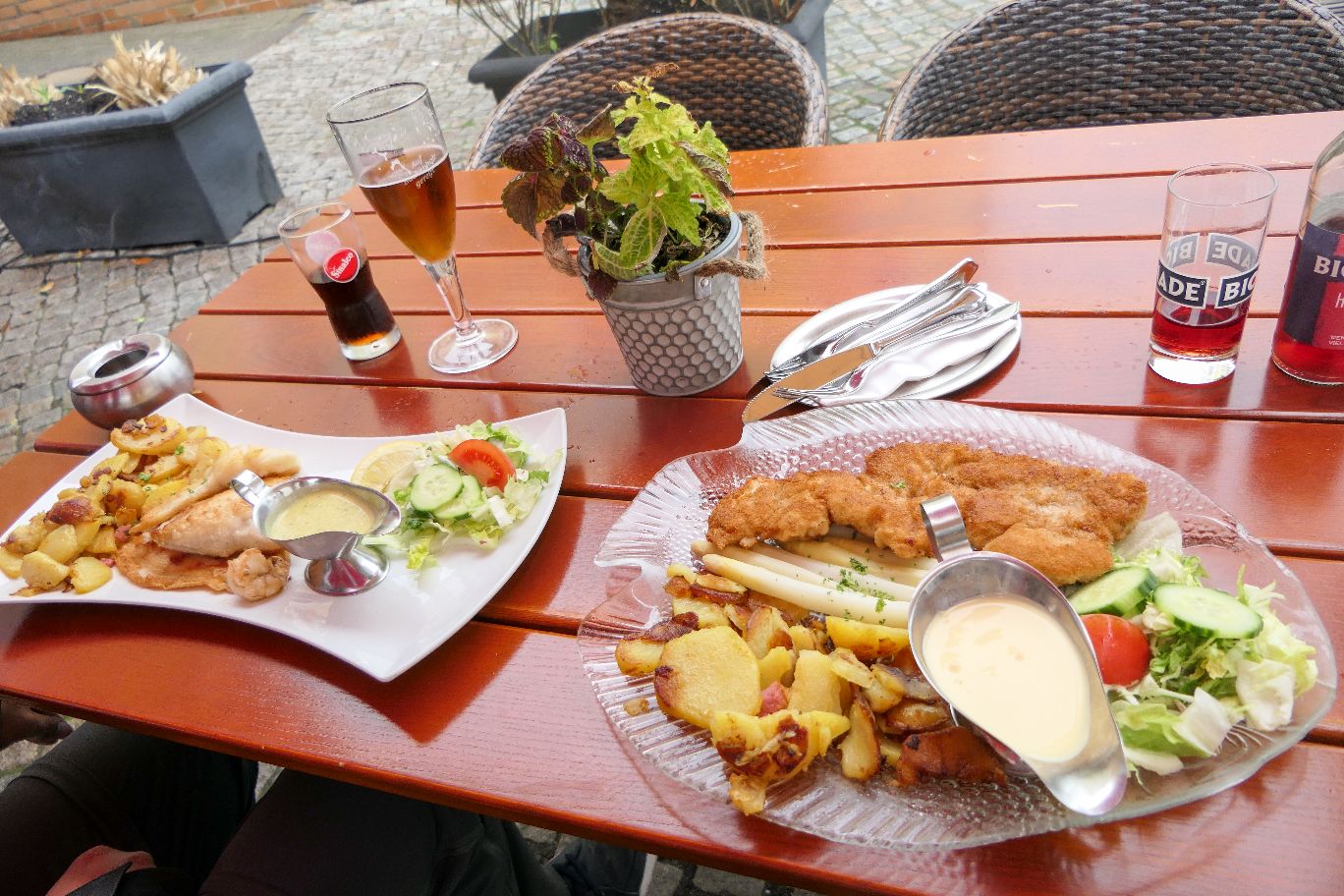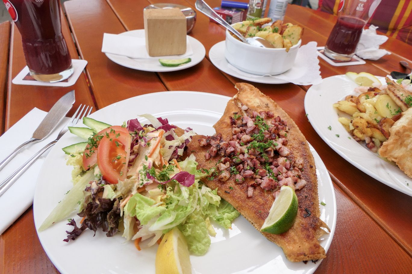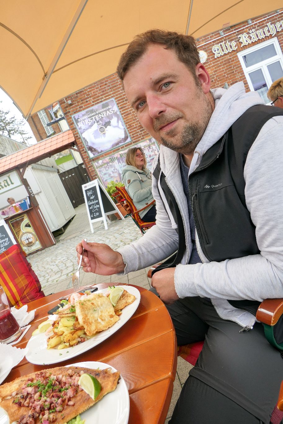 Das traditionelle Fischlokal in Kappeln an der Hafenpromenade bietet wirklich nur Fischgerichte auf seiner Karte an – aber das in bester Qualität! Wir haben uns hier ein Salat mit Krabbencocktail zur Vorspeise bestellt. Zum Hauptgericht habe ich mir eine Scholle mit knusprigen Bratkartoffeln mit Speck gegönnt und mein Freund ein Dorschfilet.