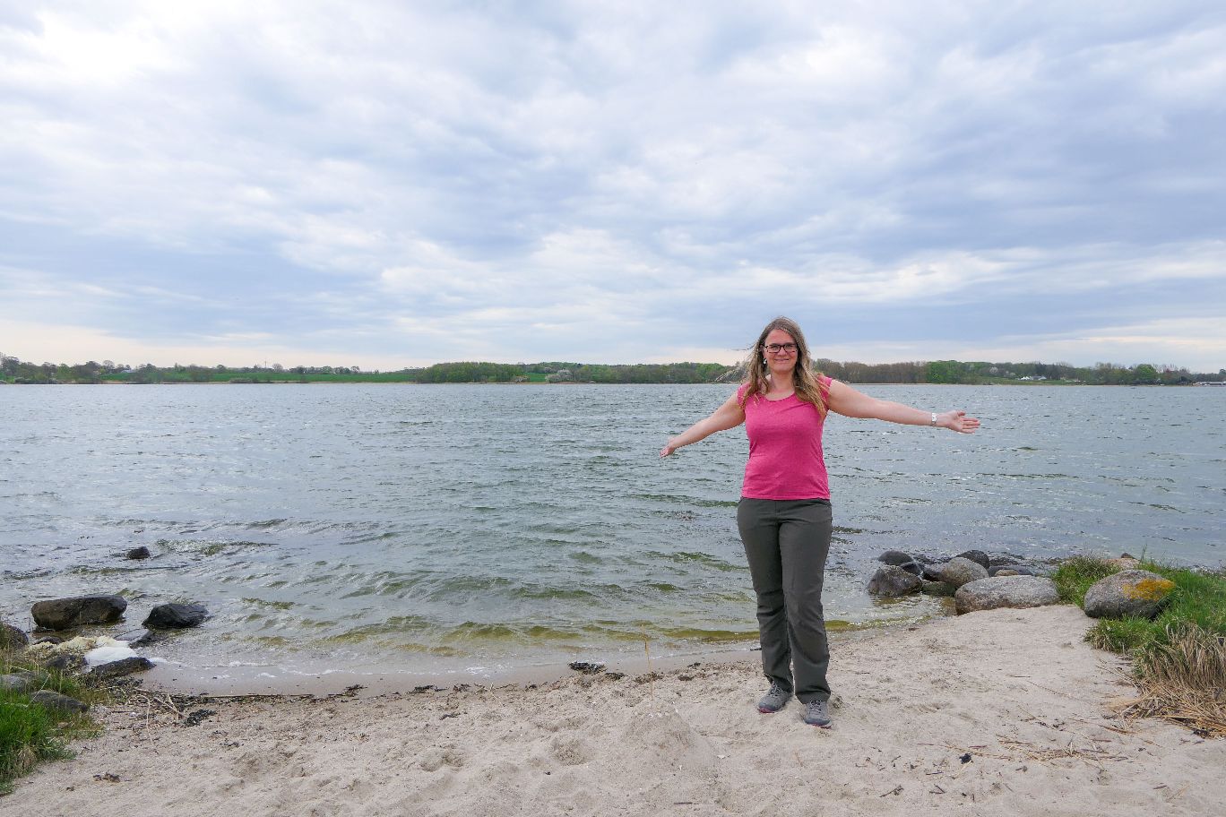Wir genießen die entspannende Fahrt durch das viele Grün, die leuchtend-gelben Rapsfelder und die kleinen Dörfer. Das ist hier mal entspanntes Fahren. In einem kleinen Ort bei Ulsnis halten wir nochmal am Ufer der Schlei ein. Hier entdecken wir einen Ministrand, wo wir eine kurze Pause bei Sonnenschein genießen. Im Sommer eignet sich das bestimmt auch super als Badestelle.