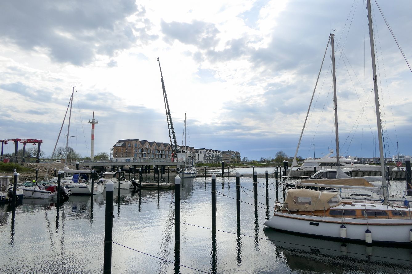 Einst war der Port Olpenitz ein Marinestützpunkt. Von 1964 bis 2004 waren hier bis zu 1850 Soldaten stationiert. Der Startschuss zur Bebauung des ca. 168 Hektar großen Grundstücks (mit Wasserflächen) zum Feriendorf wurde 2009 gegeben, ein gewagtes Projekt mit zwischenzeitlicher Insolvenz und Verkauf an weitere Investoren. Die Bauphase ist immer noch nicht abgeschlossen – im Gebäude direkt neben unserer Wohnung entstehen zum Beispiel weitere Ferienwohnungen. Insgesamt sollen es mal 2500 Betten werden.