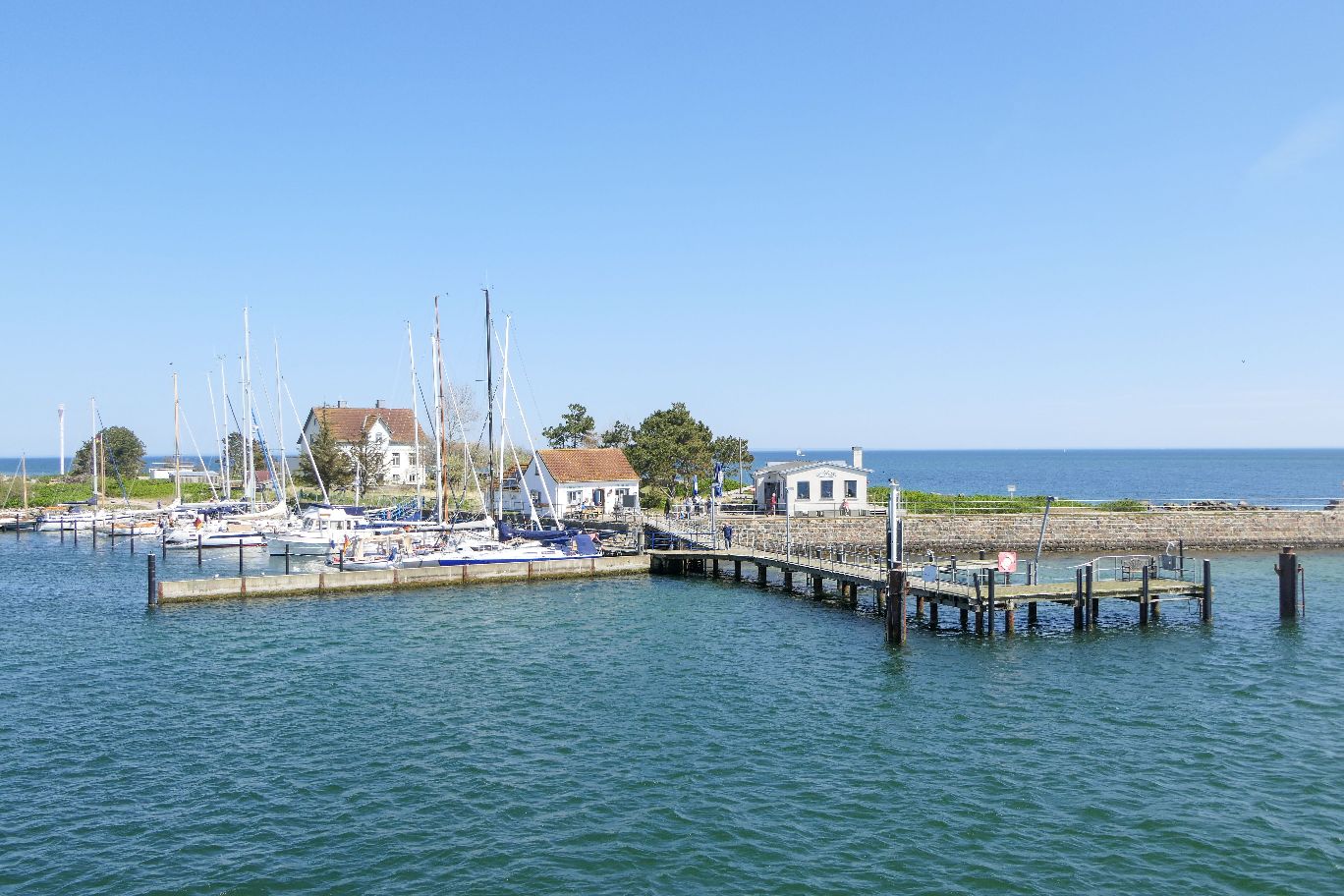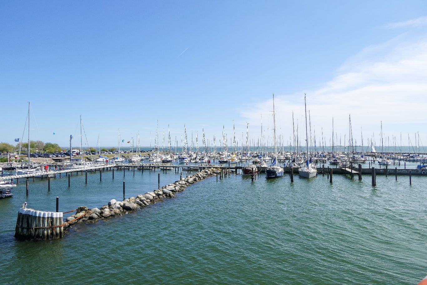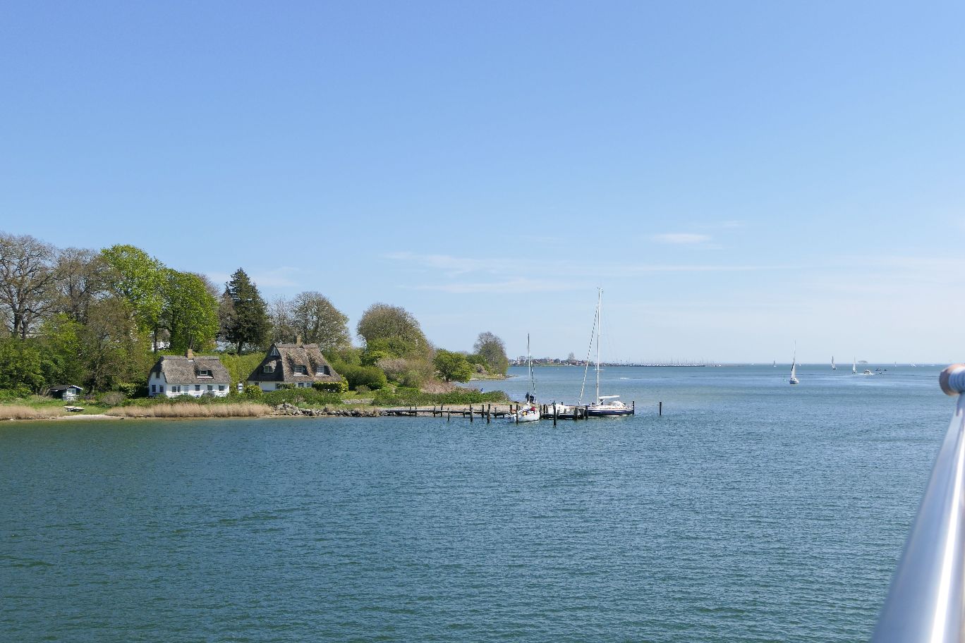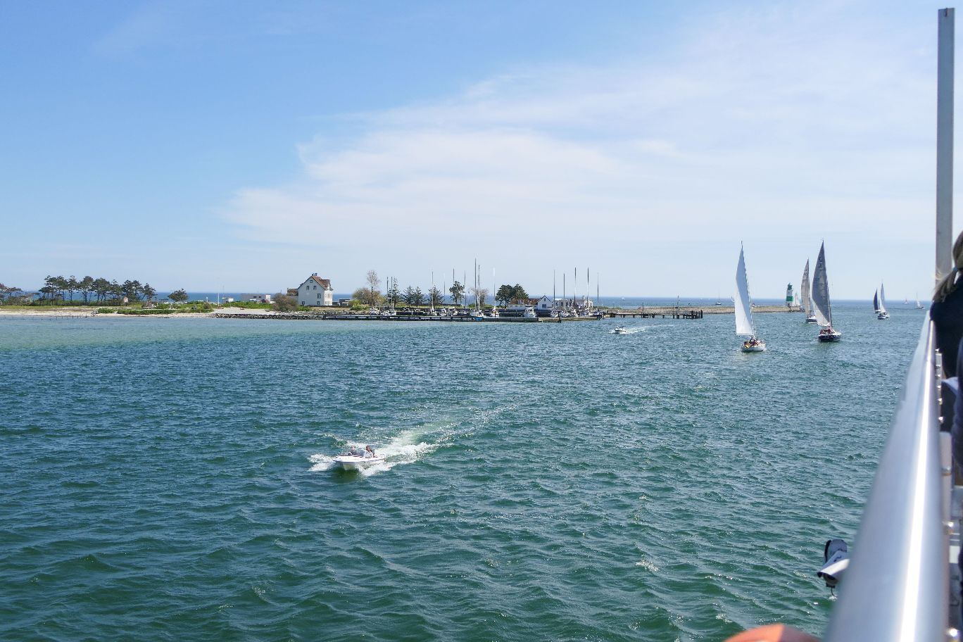 Wir nähern uns dem kleinen Ort Maasholm, wo das Schiff gegen 12.15 Uhr anlegt. Hier können theoretisch noch weitere Fahrgäste zu- oder aussteigen. Das kleine Örtchen in der Nähe der Schleimündung hat einen umso größeren Yachthafen zu bieten, dessen viele Segelboote im Wind schwanken und klirren. Unterwegs kommen uns immer wieder Segelboote entgegen, deren Steuerleute uns freundlich zuwinken.