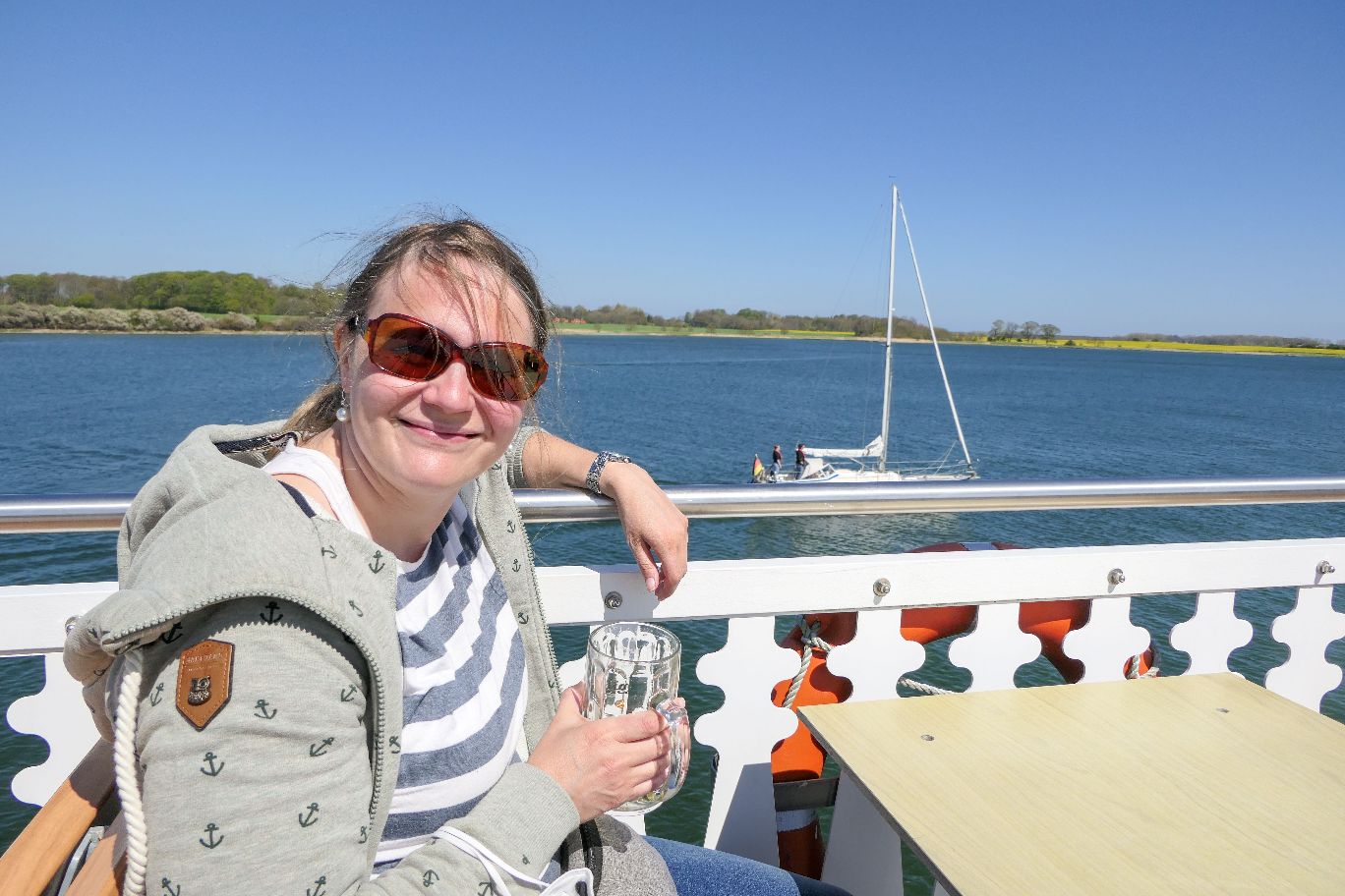 Wir haben uns für die Abfahrt um 11.45 Uhr entschieden. Von der frischen Testung am Morgen in Olpenitz sind wir direkt nach Kappeln geeilt, wo wir vor Ort noch unsere Fahrkarten erstanden haben. Eine Reservierung ist nicht notwendig, für gute Plätze an Deck solltet ihr aber nicht zu spät an Bord gehen (45min vor Abfahrt möglich). Aufgrund des Hygienekonzeptes ist zur Zeit nur jede zweite Bank benutzbar und wir hatten noch Glück ein schönes sonniges Plätzchen an der Reling zu ergattern. Am Platz ist das Tragen der Maske nicht mehr notwendig und vom Bordservice konnten wir kühle Getränke ordern.