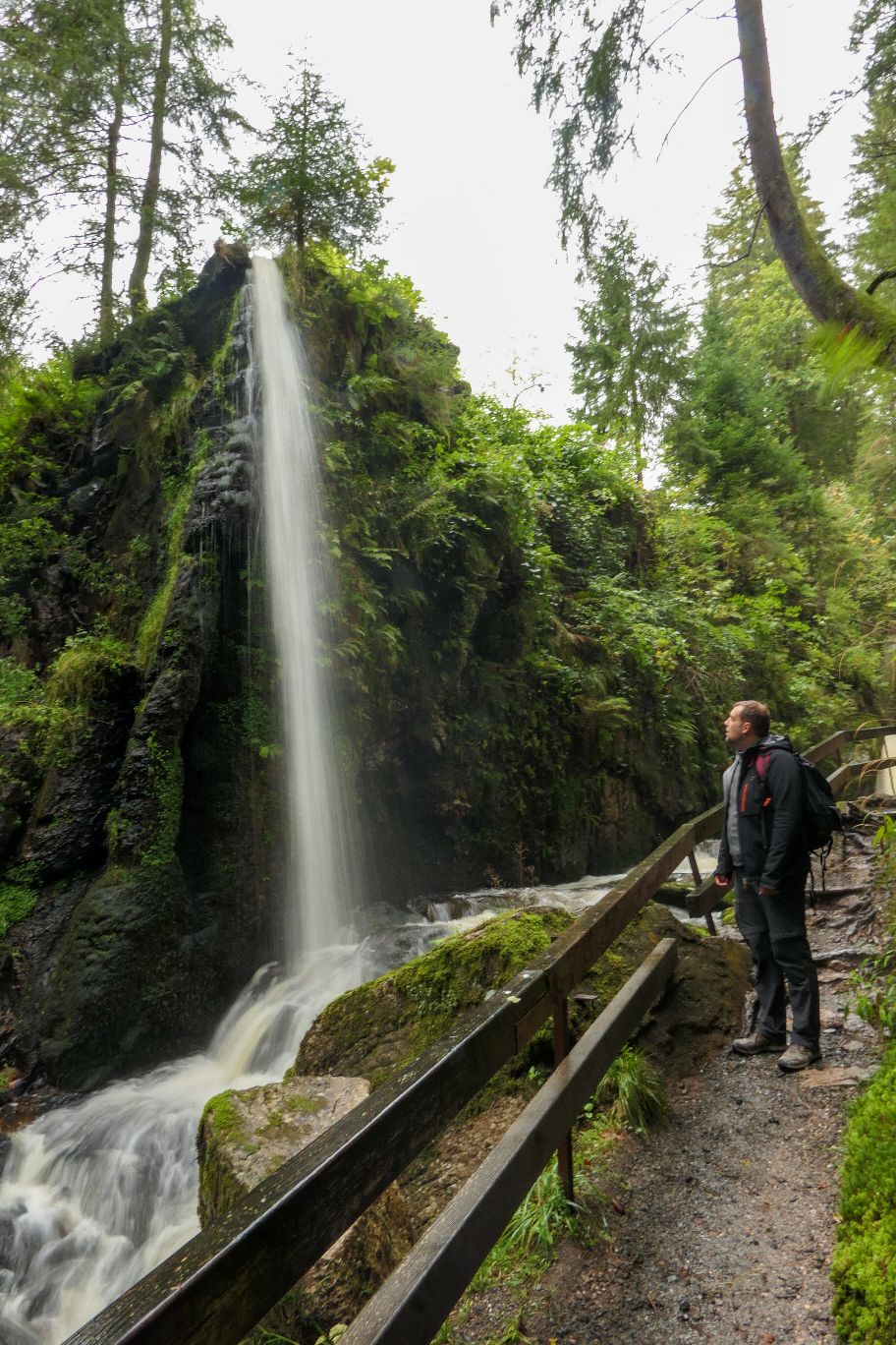 Heute stand natürlich als erstes nochmal der Todtnauer Wasserfall auf dem Programm, denn die höchste Wasserfallstufe wollten wir uns nicht entgehen lassen. Vom Zugang in Aftersteg führt ein breiter relativ flacher Wanderweg ganz bequem direkt zum Fuße des Wasserfalls. Hier sind schon mehr Wanderer unterwegs, aber längst noch nicht überfüllt. Der Eintritt kostet übrigens 2€, das Geld wirft man eigenständig in eine Box.