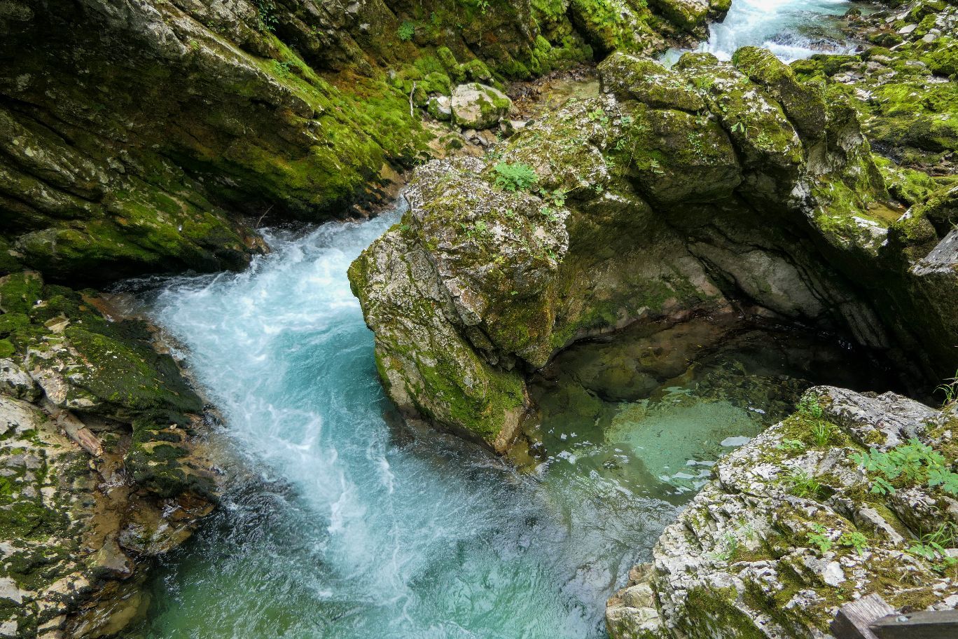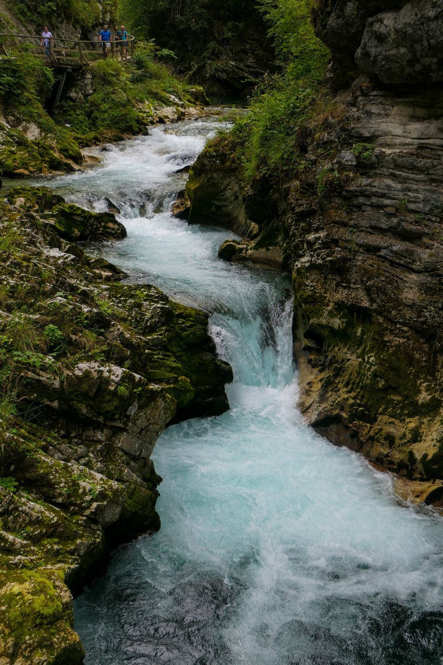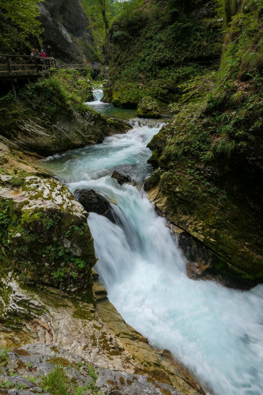 Wir laufen mal auf der rechten, mal auf der linken Seite unterhalb der steilen, senkrechten Felswände entlang und überqueren immer wieder den rauschenden Fluss Radovna. Hinter jeder Ecke offenbart sich eine neue Perspektive der Schlucht, die mal breiter und mal enger wird. Und an gefühlt jeder Ecke bleibe ich stehen, um dieses wunderschöne Naturschauspiel zu bestaunen und zu fotografieren. Glasklare Wasserbecken, die grünlich oder bläulich schimmern, wechseln sich mit schäumenden Stromschnellen und Wasserfällen ab. Es ist absolut faszinierend, das rauschende Wasser zu beobachten.