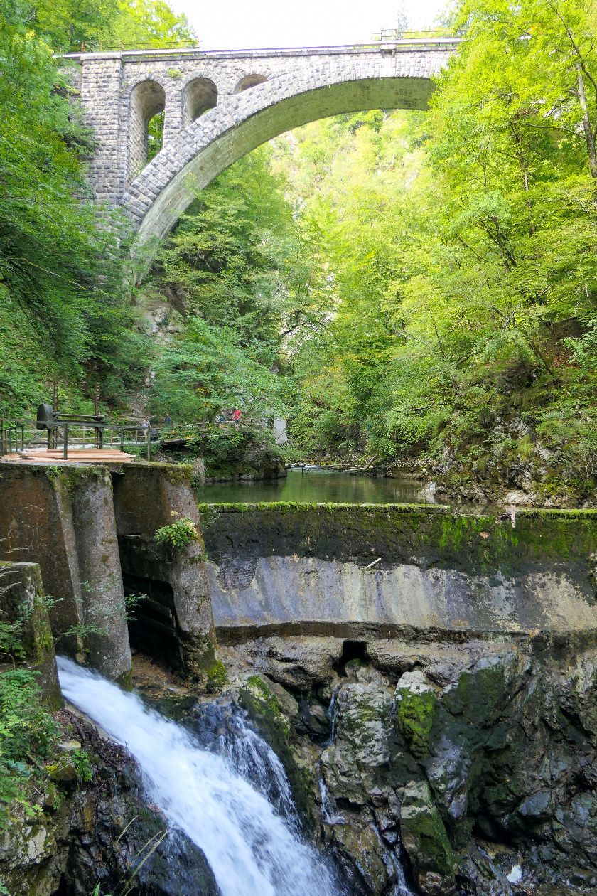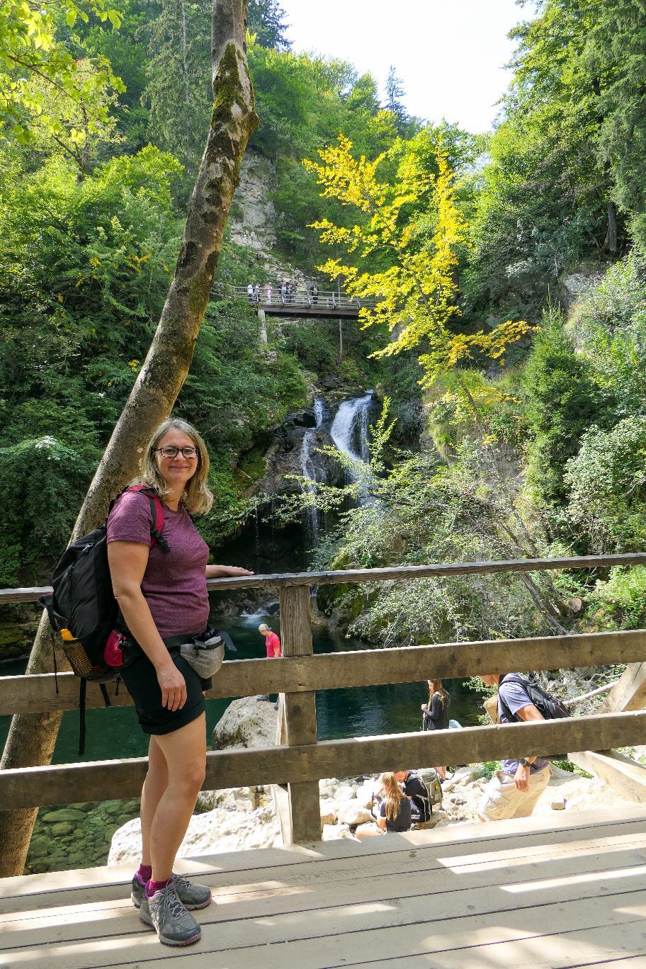 Am Ende der Klamm wird der Fluss immer mehr zu einem beschaulichem Bachlauf mit Steinchen im Wasser und grünen Bäumen am Ufer. Herrlich idyllisch! Die Klamm endet mit dem Flusswasserfall Šum. Diesen könnt ihr sowohl von oben über eine darüber liegende Brücke als auch von unten (kleiner Wanderpfad vorbei an den Toiletthäuschen) begutachten. Eine kleine Pause tut auf jeden Fall gut, bevor es weitergeht.