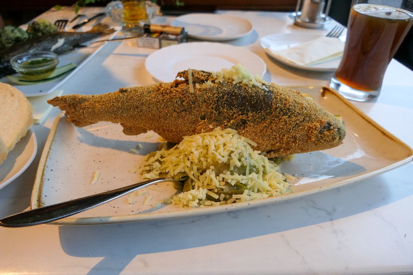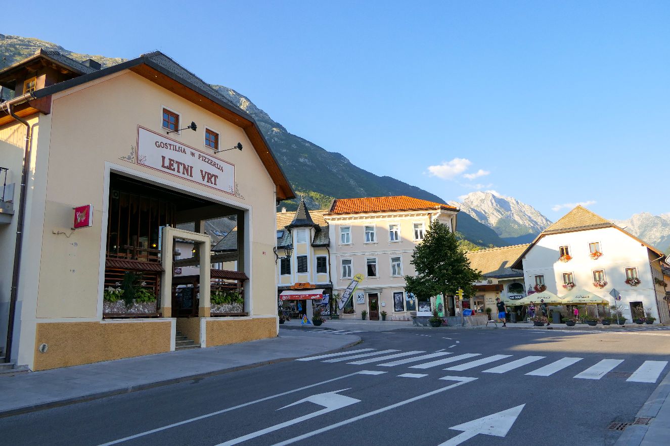 Abends machen wir uns zu Fuß zum Ortskern auf, der Weg beträgt etwa 7min. Leider gibt es in Bovec nur ein sehr begrenztes Angebot an Restaurants – nämlich drei und die sind bereits alle vorgebucht. Bei der Gaststätte Martinov haben wir beim 2.Anlauf dennoch Glück. Wir bestellen ganz traditionell Forelle – einmal gegrillt und einmal nach Bovecer Art mit einer Grießpanade. Eine leckere Spezialität aus der Gegend.
