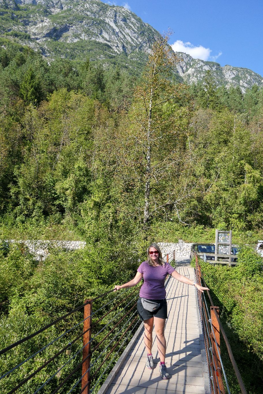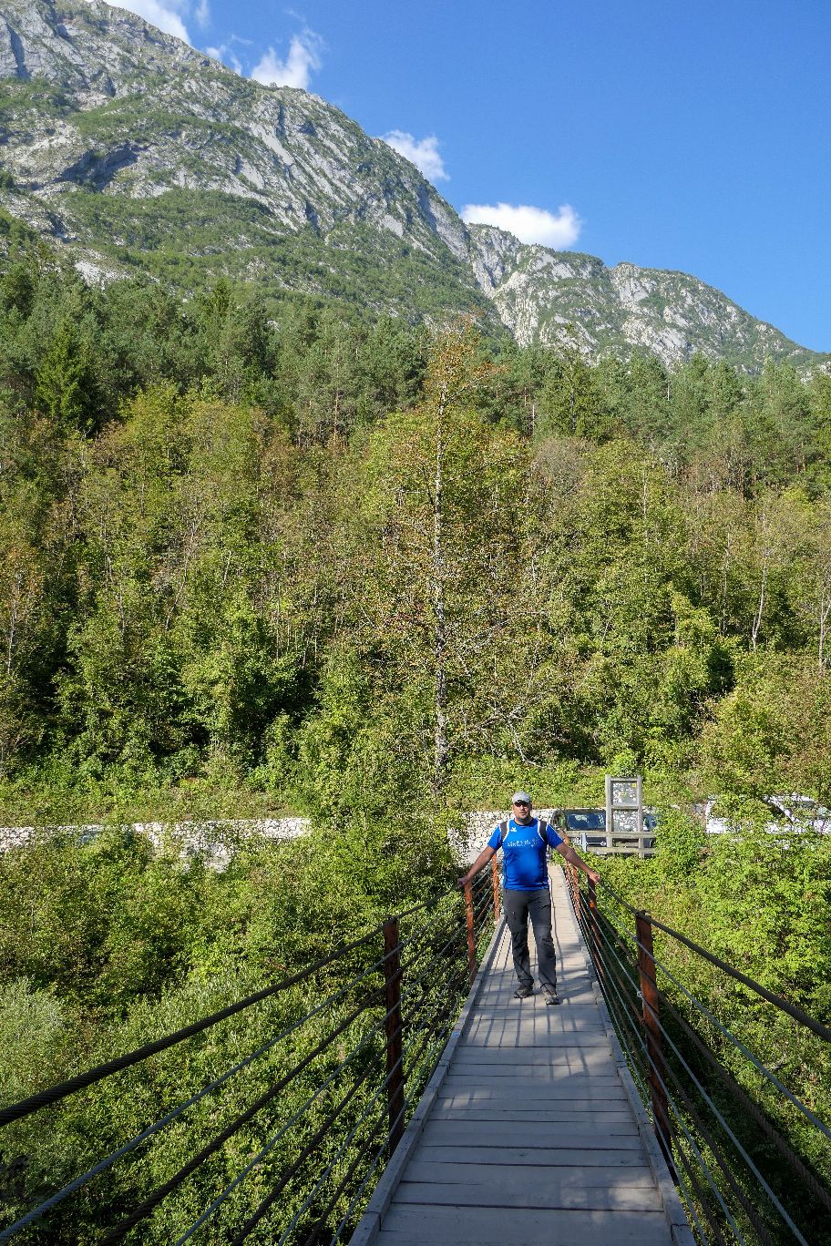 Über Trenta erreichen wir schließlich das grüne Soča Tal. Von hier sind es noch eine gute halbe Stunde bis zu unserem Ziel Bovec. Die Straße führt bereits entlang der Soča und immer wieder sehen wir Hängebrücken, die über den wilden Fluss gespannt sind. An einer Stelle legen wir nochmal einen Stopp ein und erwischen anscheinend zufällig die kleine Soča Schlucht (hier werden wir am nächsten Tag noch wandern gehen). Sieht schon mal sehr vielversprechend aus!