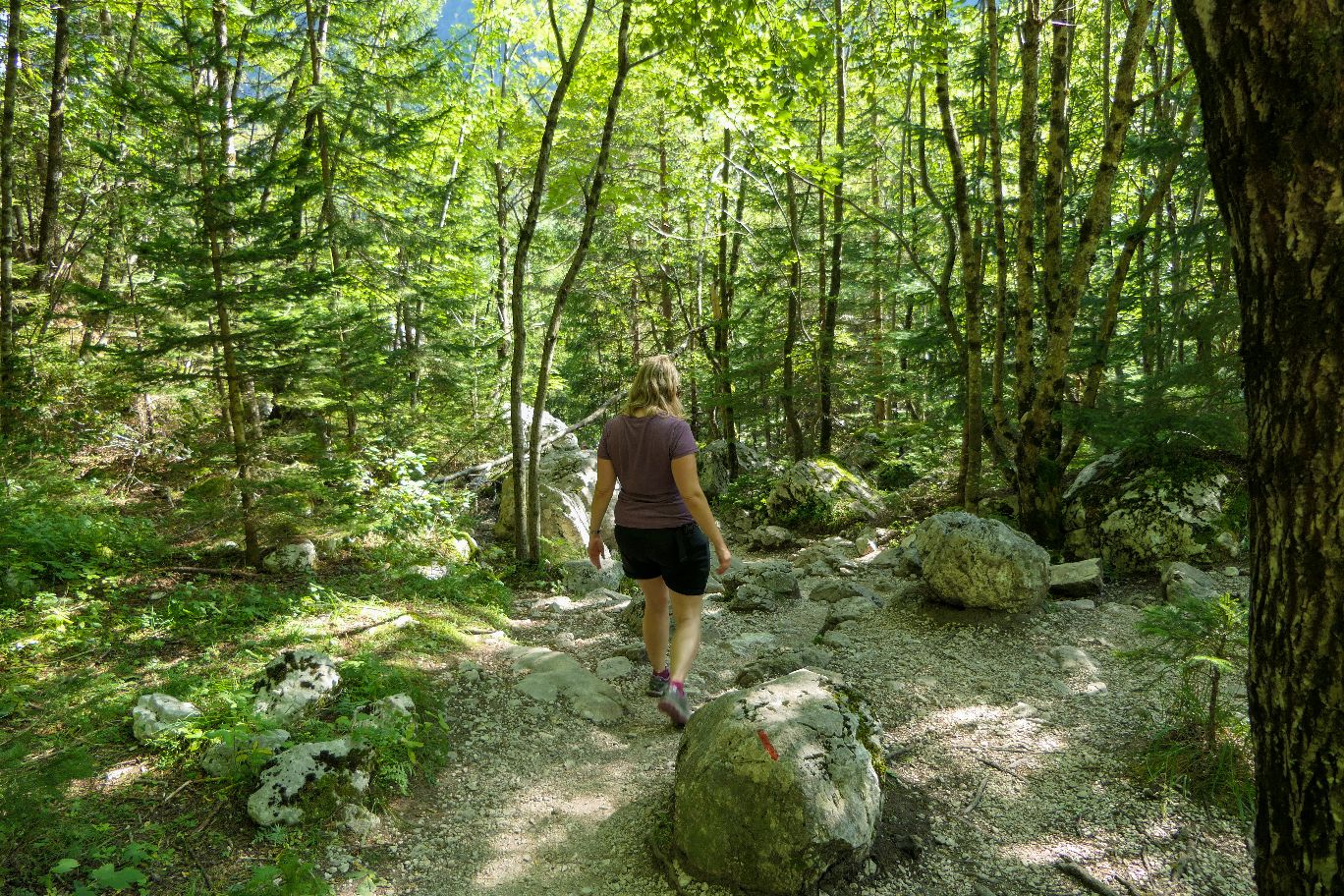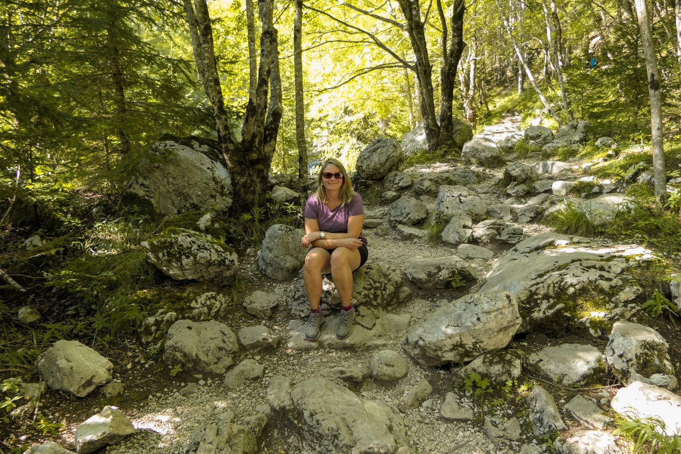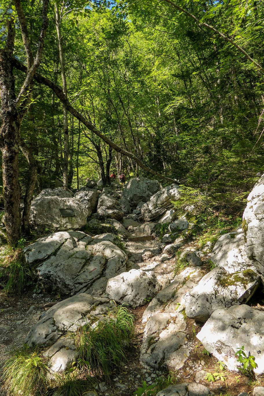 Die kurvige Abfahrt führt wieder in den Wald hinein. Inmitten einer Kehre folgt die Abzweigung zur Soča Quelle bzw. erstmal dem Parkplatz mit Wirtshaus. Von hier führt der Wanderweg bergauf über Stock und Stein durch den Wald. Ehrlich gesagt haben wir das etwas unterschätzt und als uns andere Wanderer erzählen, dass der Weg noch weiter bergauf führt und zur Quelle hin in einen anspruchsvollen Klettersteig endet, machen wir lieber Kehrt. Das ist nichts für uns. Stattdessen schauen wir uns den ersten steinigen Bachlauf der Soča samt kleinen Wasserfall an.