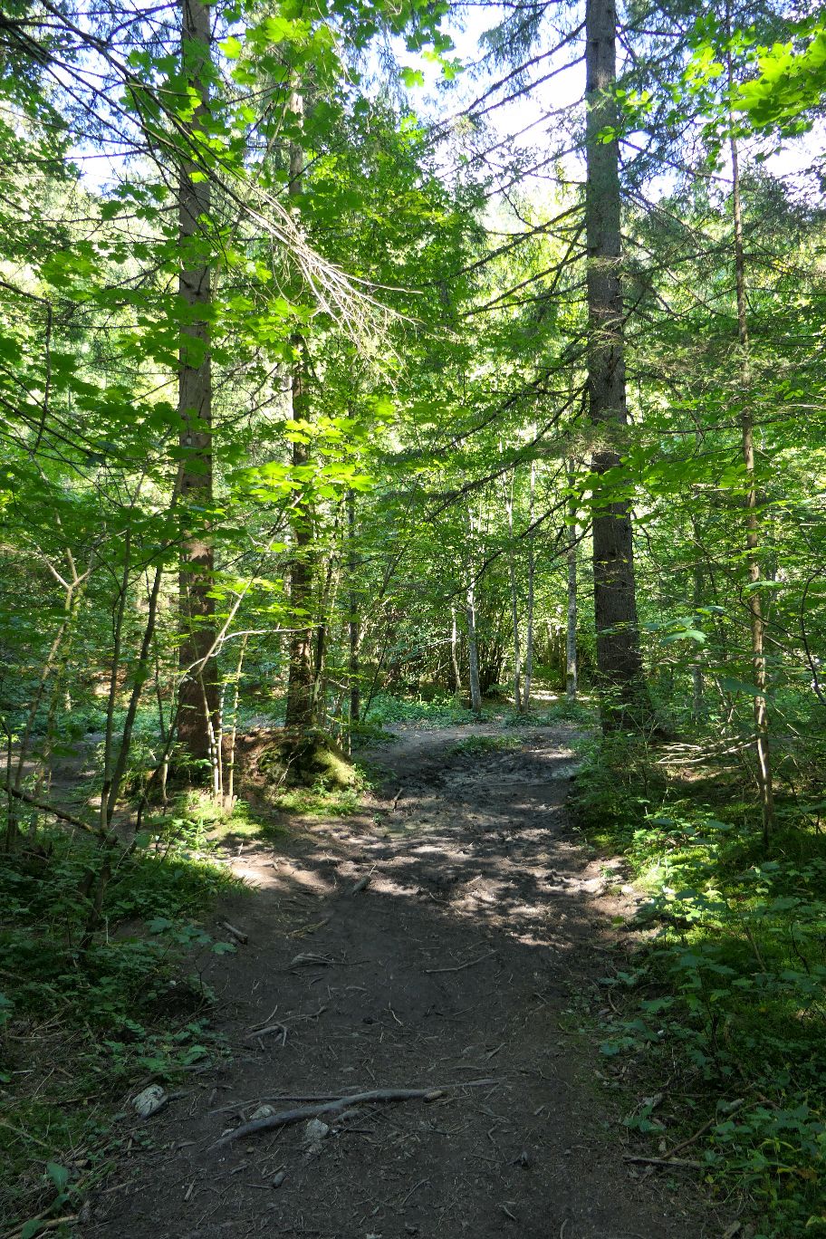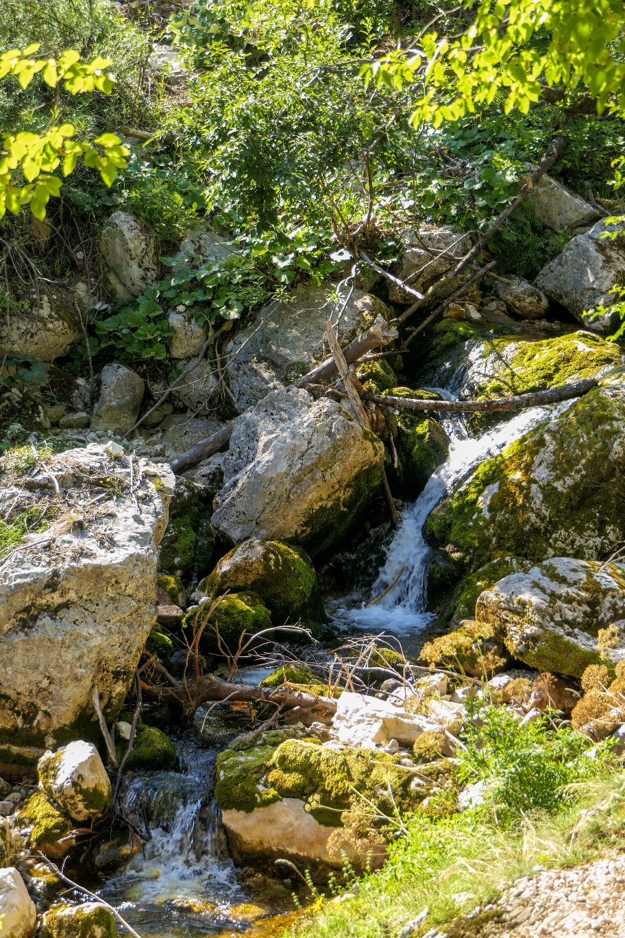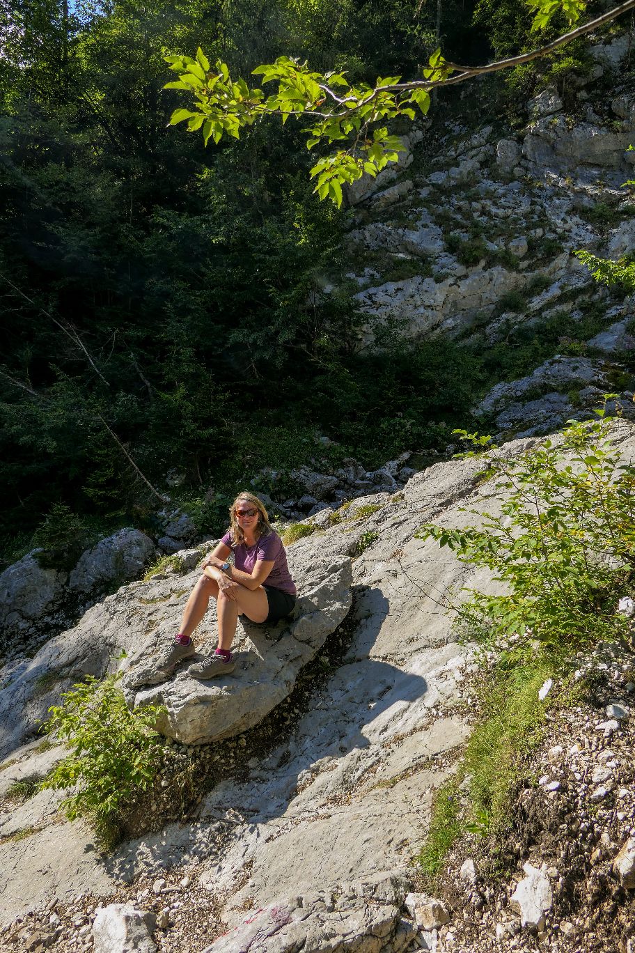 Die kurvige Abfahrt führt wieder in den Wald hinein. Inmitten einer Kehre folgt die Abzweigung zur Soča Quelle bzw. erstmal dem Parkplatz mit Wirtshaus. Von hier führt der Wanderweg bergauf über Stock und Stein durch den Wald. Ehrlich gesagt haben wir das etwas unterschätzt und als uns andere Wanderer erzählen, dass der Weg noch weiter bergauf führt und zur Quelle hin in einen anspruchsvollen Klettersteig endet, machen wir lieber Kehrt. Das ist nichts für uns. Stattdessen schauen wir uns den ersten steinigen Bachlauf der Soča samt kleinen Wasserfall an.