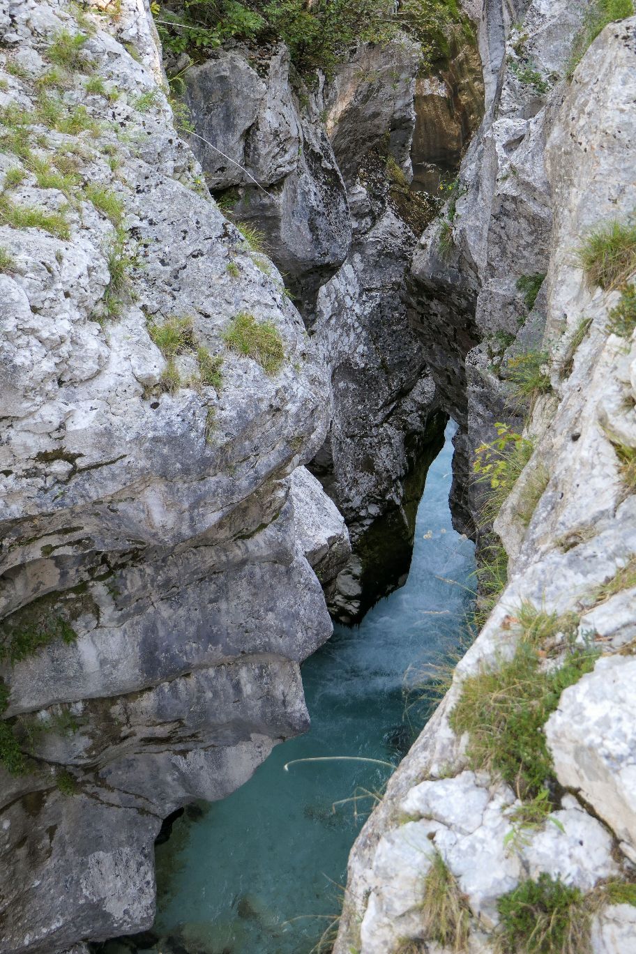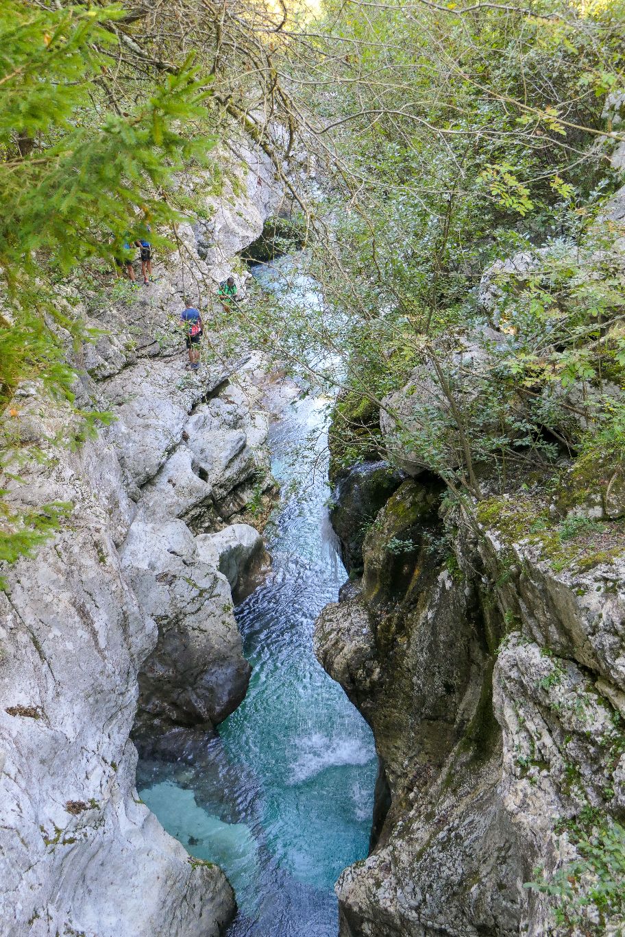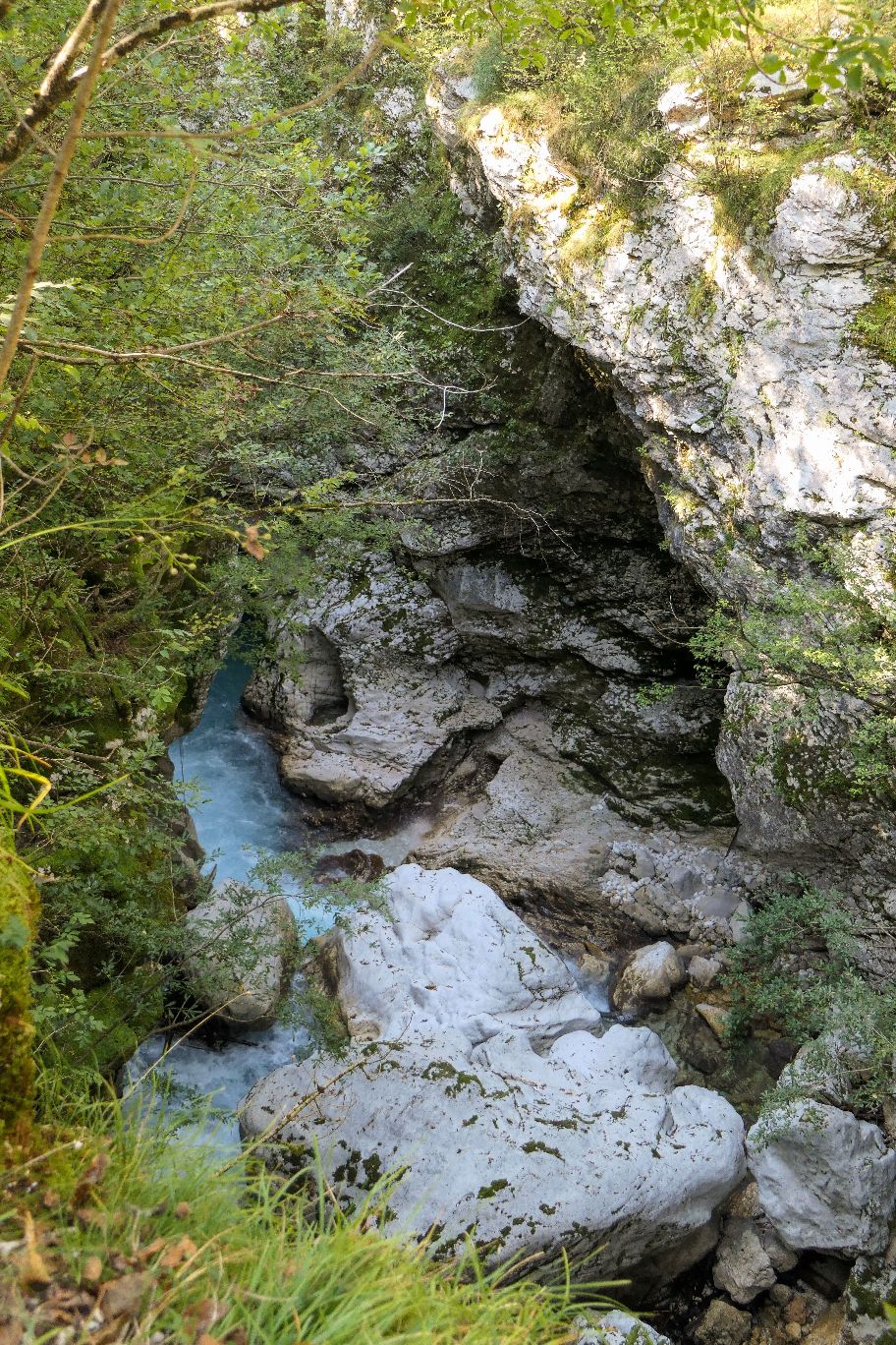 Der Wanderweg führt nun entlang der wilden Soča und den großen Trögen, die wie eine Schlucht immer enger und steiler wird. Von oben herab eröffnen sich uns immer wieder Einblicke auf das dunkeltürkis schimmernde Wasser zwischen den Felswänden.