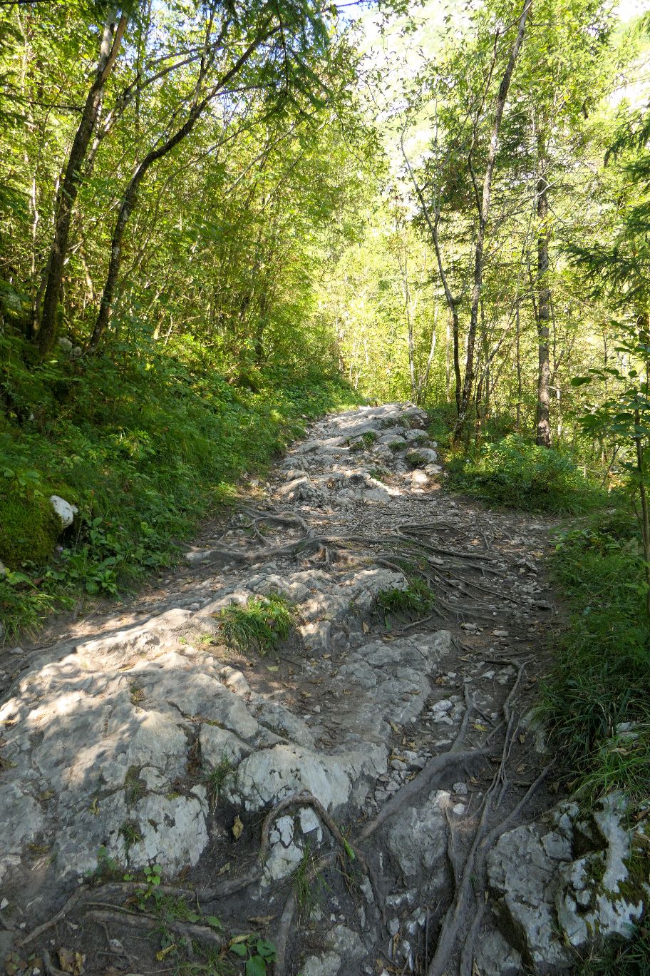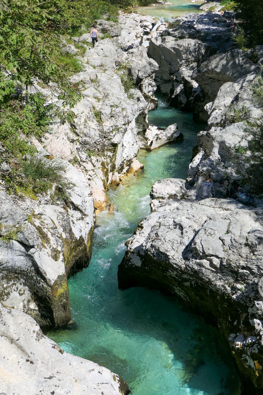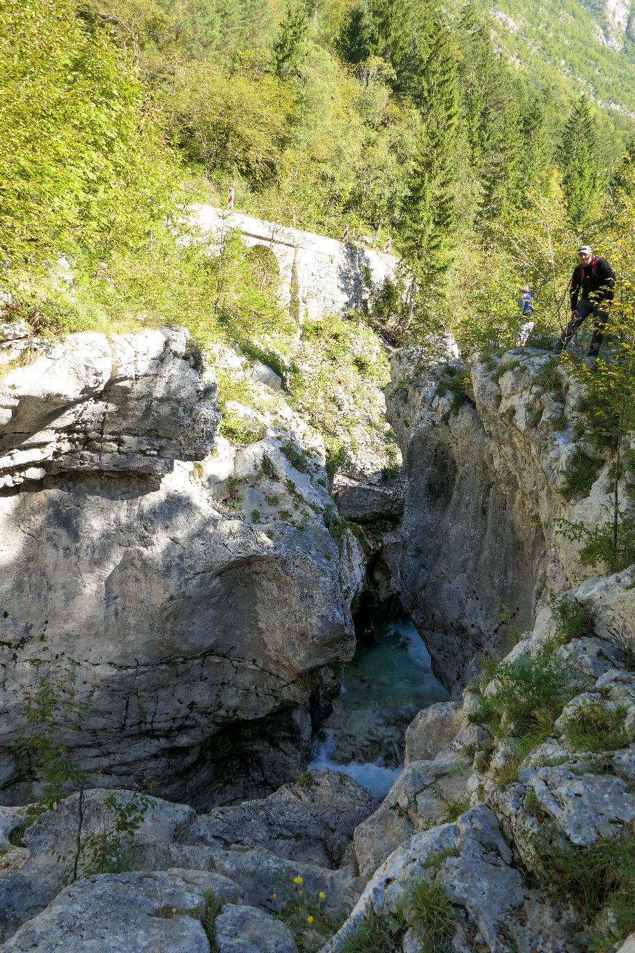 Der Wanderweg führt nun entlang der wilden Soča und den großen Trögen, die wie eine Schlucht immer enger und steiler wird. Von oben herab eröffnen sich uns immer wieder Einblicke auf das dunkeltürkis schimmernde Wasser zwischen den Felswänden.
