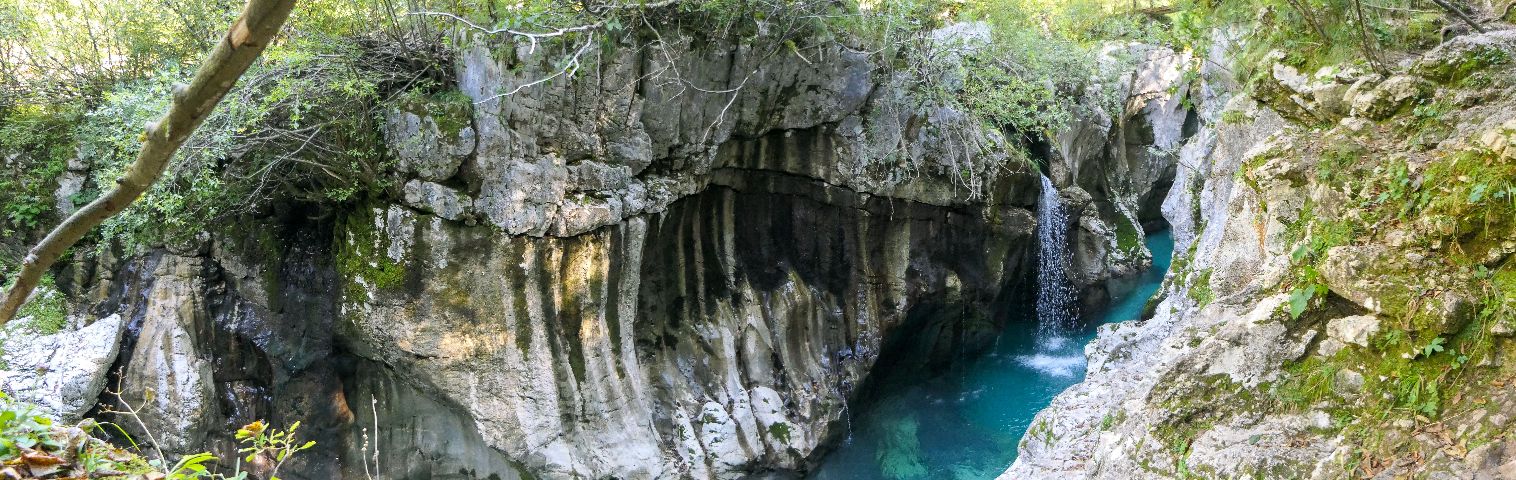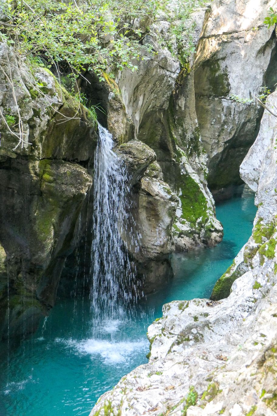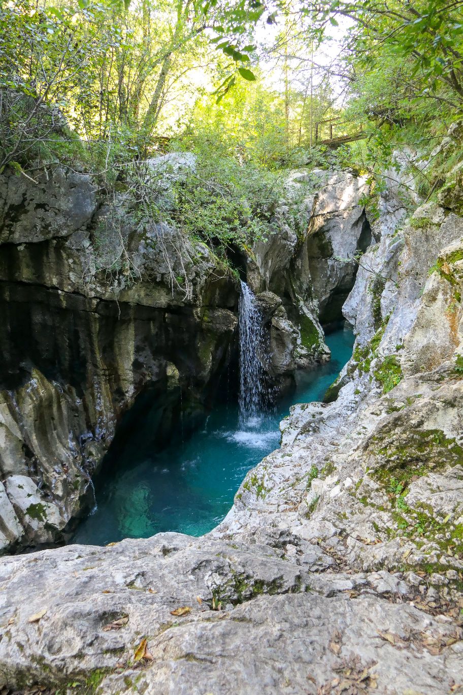 Hier haben wir das Herz der großen Soča Tröge – oder auf slowenisch Velika korita Soče – erreicht. Bei einer kleinen Verschnaufpause saugen wir den Blick auf die Schlucht mit den engen Felströgen, das türkisfarbene Wasser und den kleinen Wasserfall in uns auf. Ein bezauberndes Naturjuwel und einer meiner Lieblingsplätze in diesem Urlaub! Ich hoffe, die Bilder können die Magie dieses Ortes nur annähernd übermitteln.