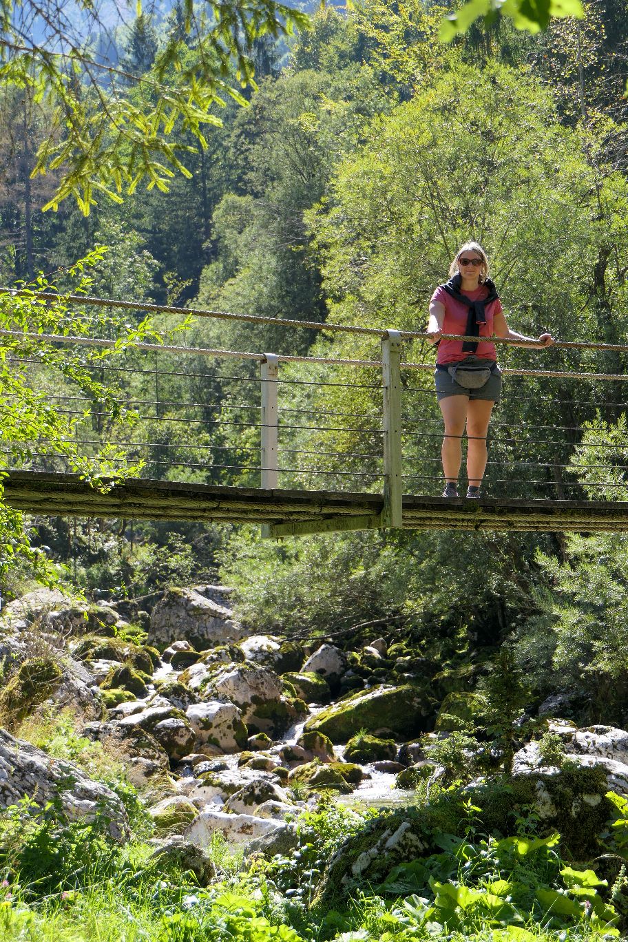 Durch den grünen Wald folgen wir immer weiter entlang des Flusses. Immer mal wieder bieten kleine Brücken wunderschöne Aussichten auf die Soča – wie aus dem Bilderbuch!