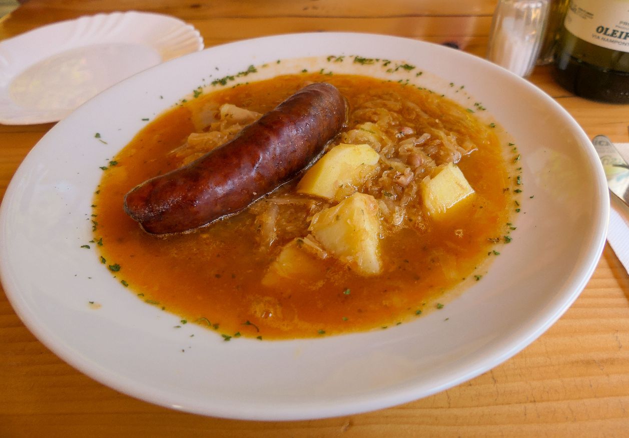 Pünktlich zur Mittagszeit sind wird am Ende der Wanderung und kehren in der Nähe in Soča in einer Gaststätte ein. Hier probiere ich zum ersten Mal die slowenische Jota – eine deftige Sauerkrautsuppe mit Kartoffeln und Wurst. Mir hat sie total gut geschmeckt.