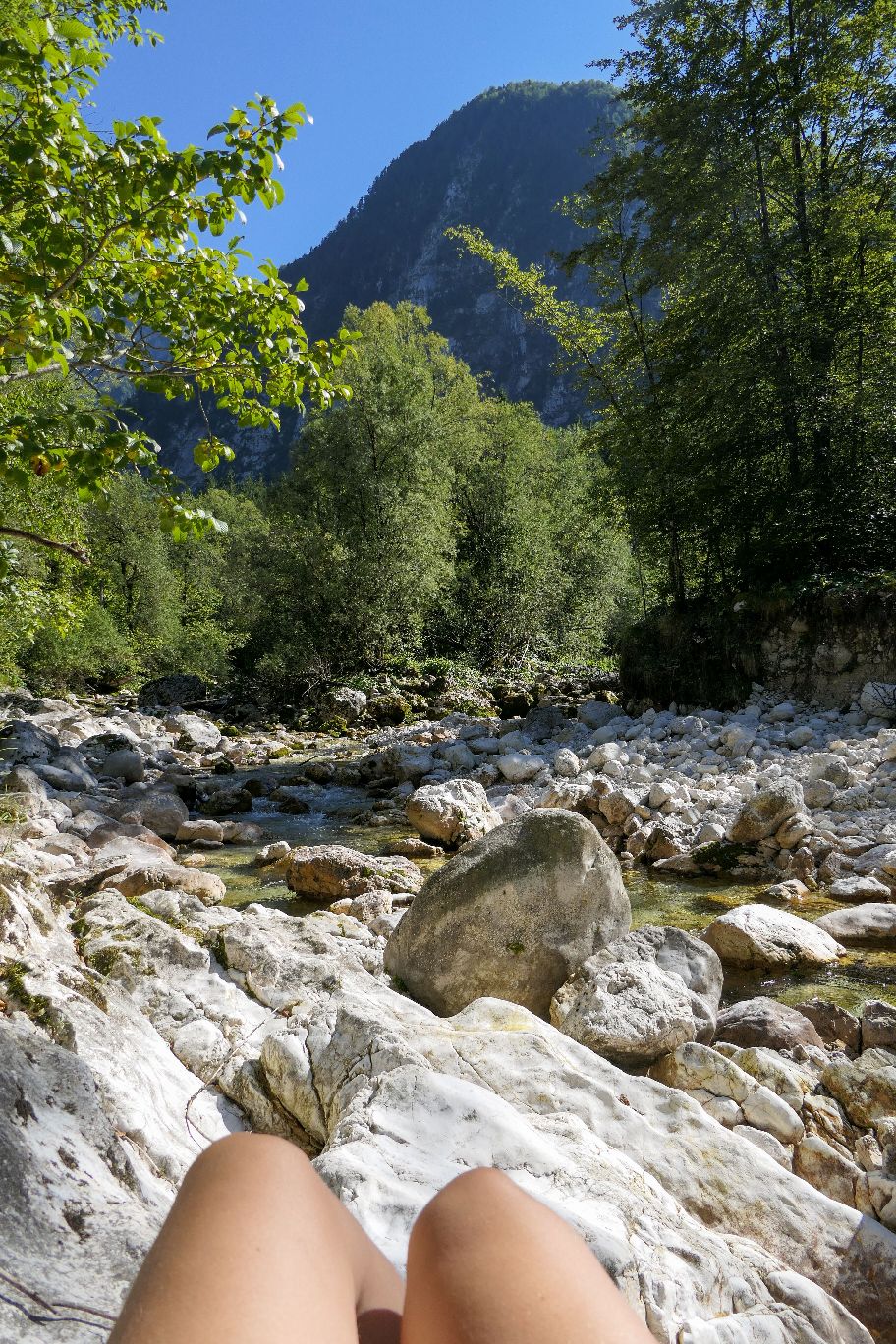 Anschließend wollen wir noch einen weiteren Wildbach – die Lepenjica – in der Gegend besuchen. Dazu fahren wir in Richtung Lepena bis zum Wanderparkplatz. Am steinigen Flussbett gönnen wir uns eine längere Pause mitten in der Natur. Auf einem gut geformten Fels kann man herrlich relaxen. Natürlich lockt auch das Wasser, unsere beanspruchten Wanderfüße mal zu erfrischen. Aber huuuuuhhh, das Wasser ist wirklich eisig kalt!