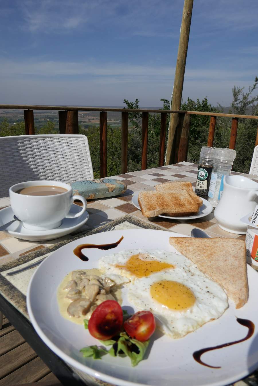 Von unserer Holzveranda vor dem Zelt mit gemütlichen Sitzmöglichkeiten haben wir wirklich einen traumhaften Blick auf die Kleine Karoo, die Outeniqua und Swartberge. Mit einem kühlen Getränk in der Hand chillen wir hier erstmal ein Weilchen in der Sonne. So herrlich!